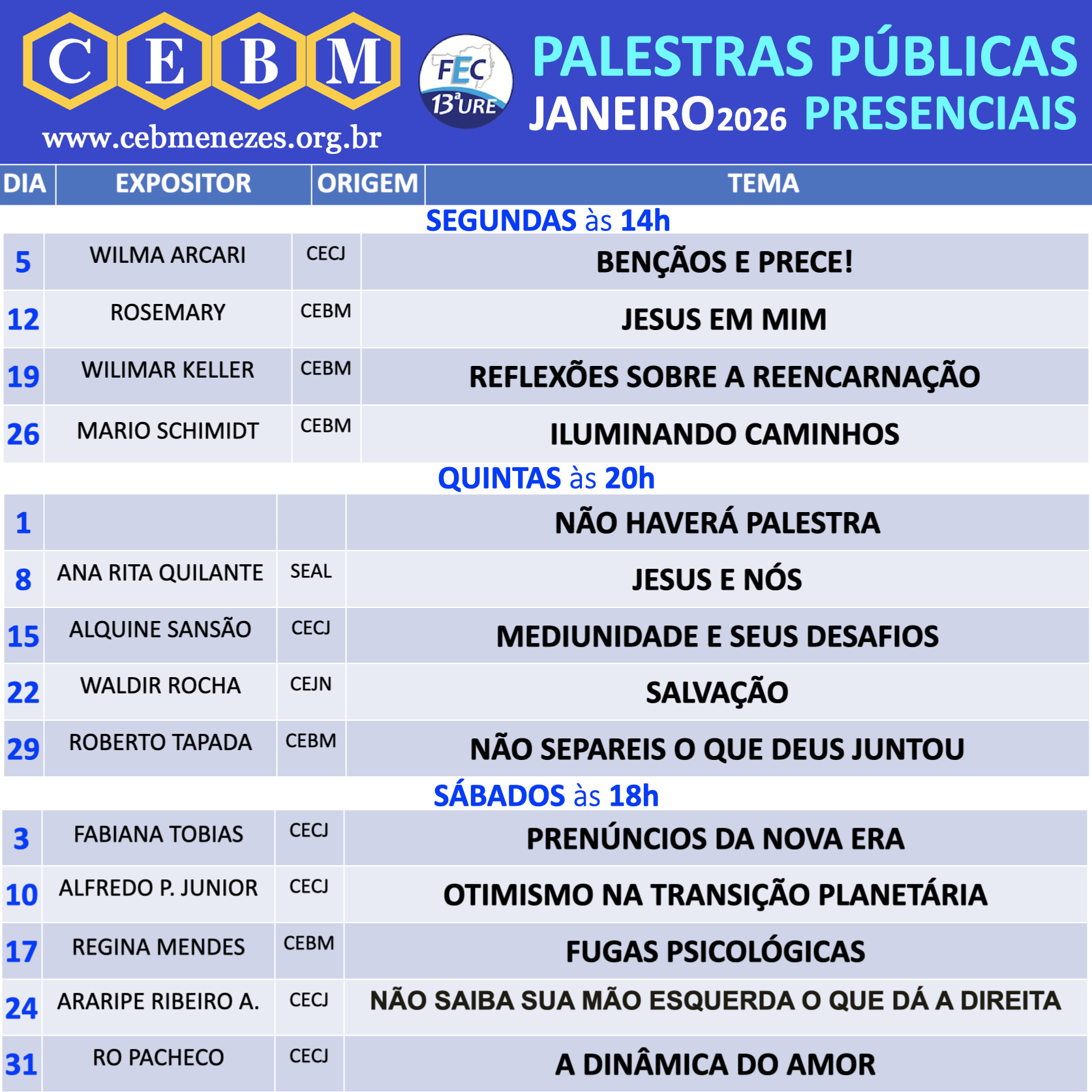 HORÁRIOS E TEMAS DAS PALESTRAS PÚBLICAS PRESENCIAIS - JANEIRO /2026