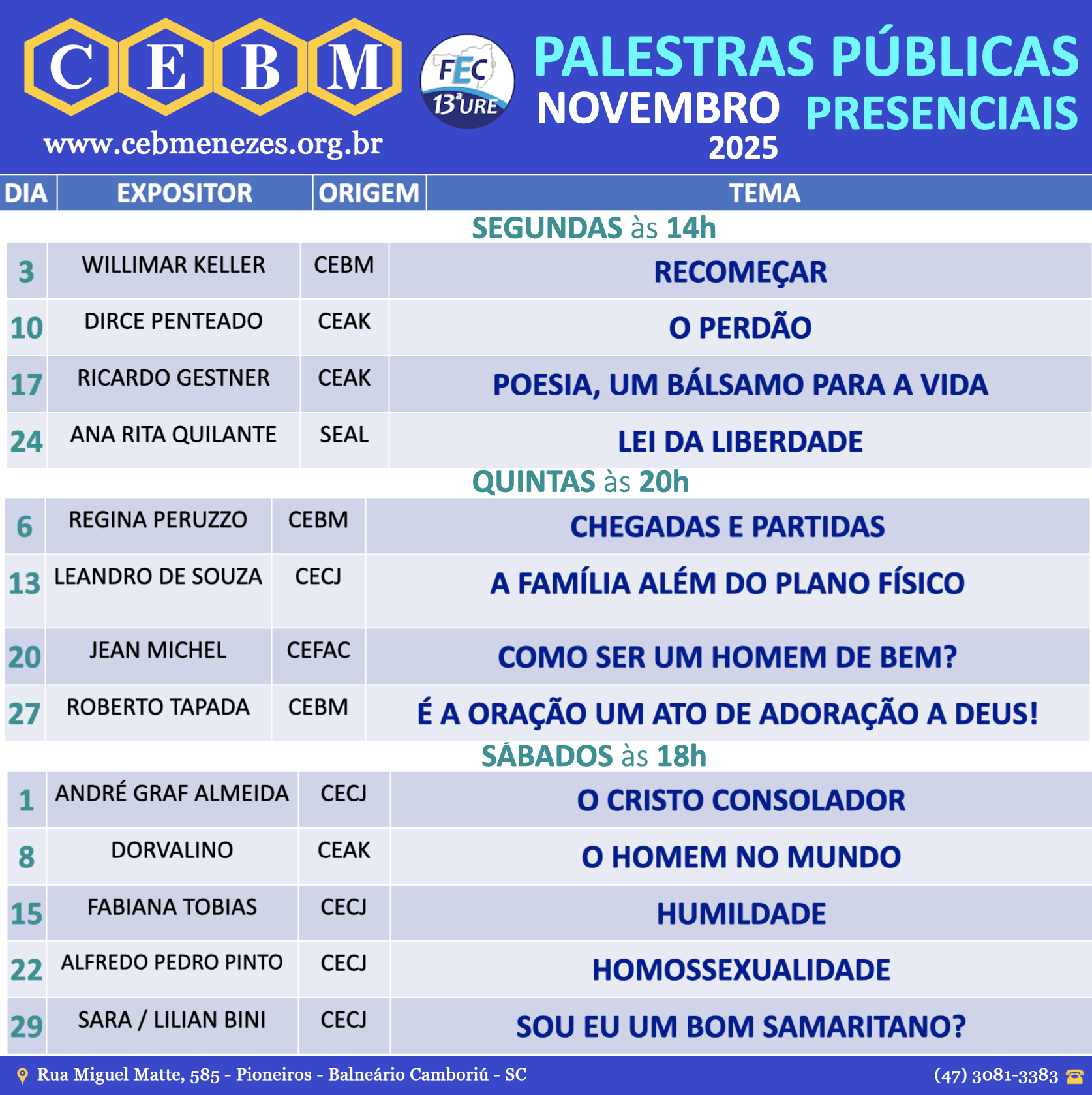HORÁRIOS E TEMAS DAS PALESTRAS PÚBLICAS PRESENCIAIS - NOVEMBRO /2025